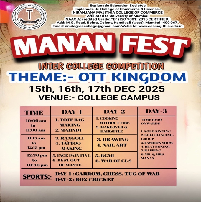 Manan Fest 2025, the grand annual winter festival of Niranjana Majithia College of Commerce, was successfully organized from 15th to 17th December 2025 with great enthusiasm and grandeur. As the flagship inter-collegiate event of the college, MANAN continues to uphold its legacy of excellence, innovation, creativity, and vibrant student engagement.